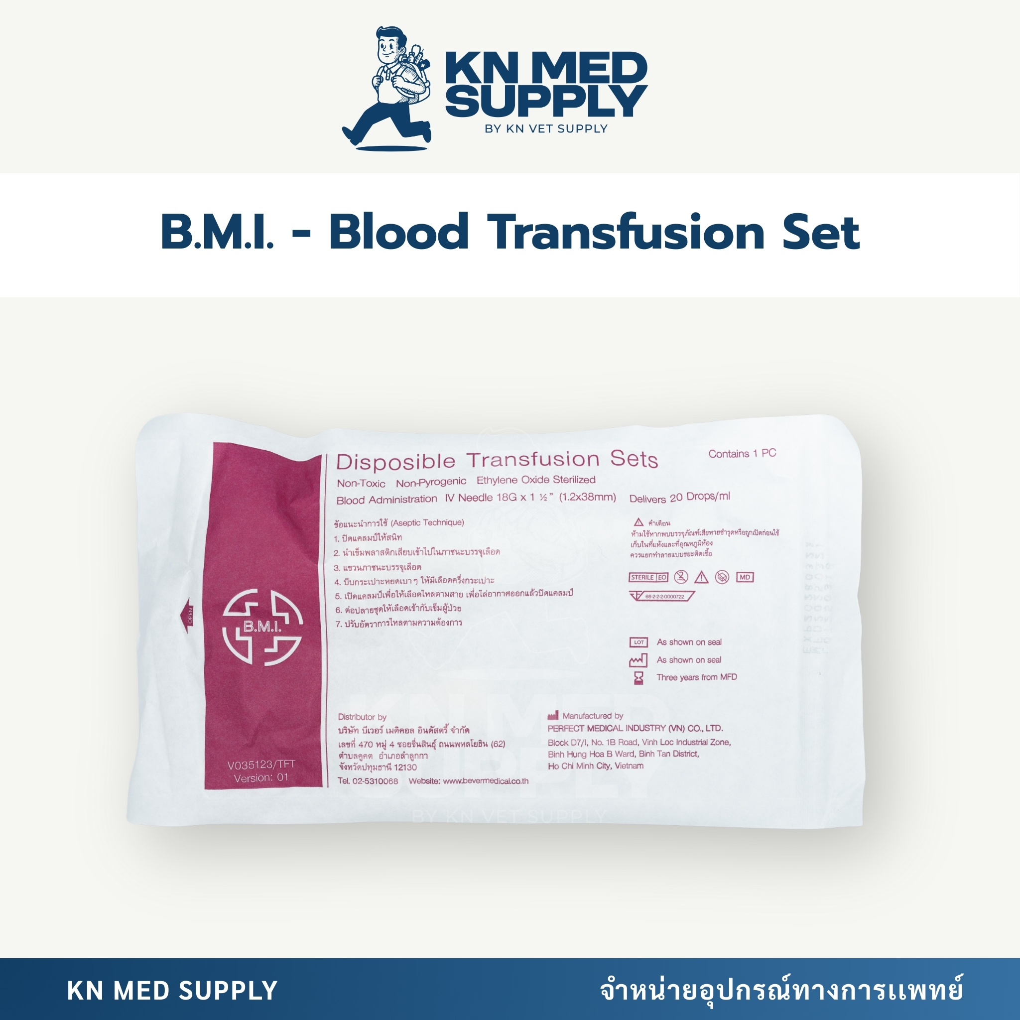 B.M.I. – Blood Transfusion Set เป็นชุดให้เลือดที่ออกแบบมาสำหรับการให้เลือด ผลิตจากวัสดุเกรดการแพทย์
